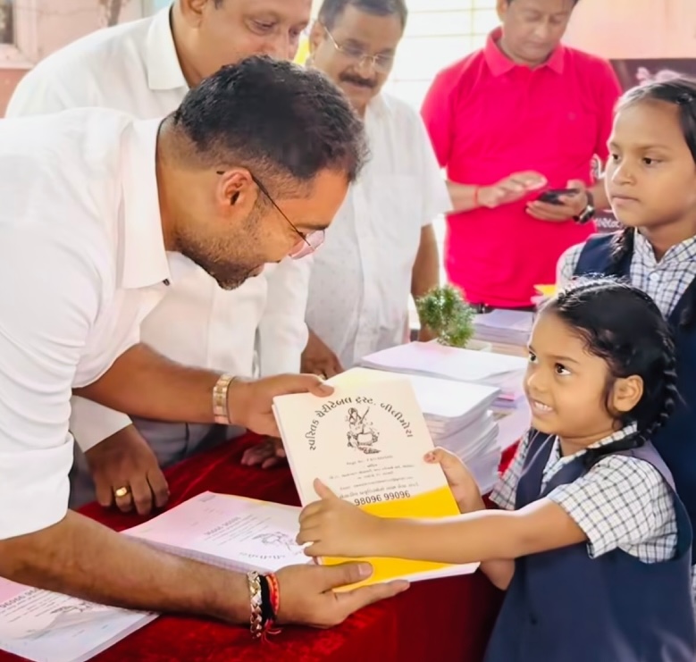 Swastik Charitable Trust recently organized a heartwarming initiative at the 78-year-old Somnath Vidyalaya in Bilimora, blending the values of education and environmental responsibility. The Trust distributed educational books to students, aiming to encourage reading habits, support academic growth, and uplift the learning environment for young minds.